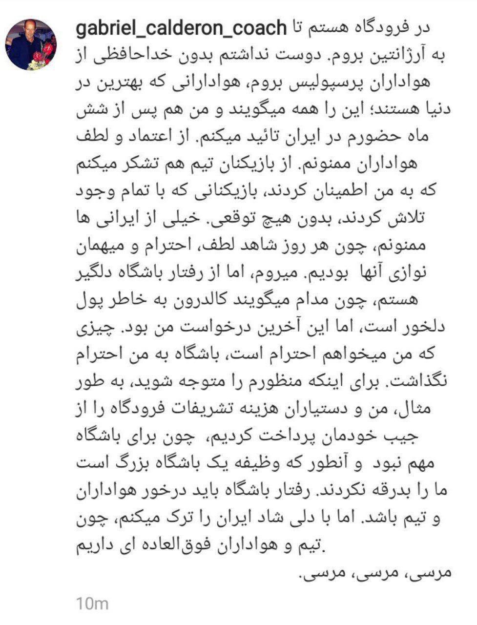کالدرون پیش از ترک تهران با انتشار متنی در شبکه های اجتماعی نوشت: