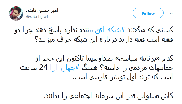 عصرایران؛ مصطفی داننده- مجری برنامه جهانآرای شبکه افق، توییت کرده است که:« کسانی که میگفتند #شبکه_افق بیننده ندارد پاسخ دهند چرا دو هفته است همه دارند درباره این شبکه حرف میزنند؟ کدام «برنامه سیاسی» صداوسیما تاکنون این حجم از حمایتهای مردمی را داشته؟ هشتگ #جهان_آرا 24 ساعت است که ترند اول توییتر فارسی است. کاش مسئولین قدر این سرمایه اجتماعی را بدانند.»