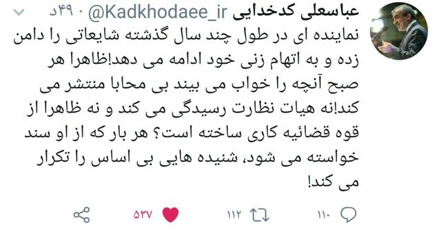به گزارش ایسنا، عباسعلی کدخدایی در صفحه شخصی خود در توئیتر نوشت: «نمایندهای در طول چند سال گذشته شایعاتی را دامن زده و به اتهامزنی خود ادامه میدهد! ظاهرا هر صبح آنچه را خواب میبیند بیمحابا منتشر میکند! نه هیات نظارت رسیدگی میکند و نه ظاهرا از قوه قضاییه کاری ساخته است؟ هر بار که از او سند خواسته میشود، شنیدههایی بیاساس را تکرار میکند!»