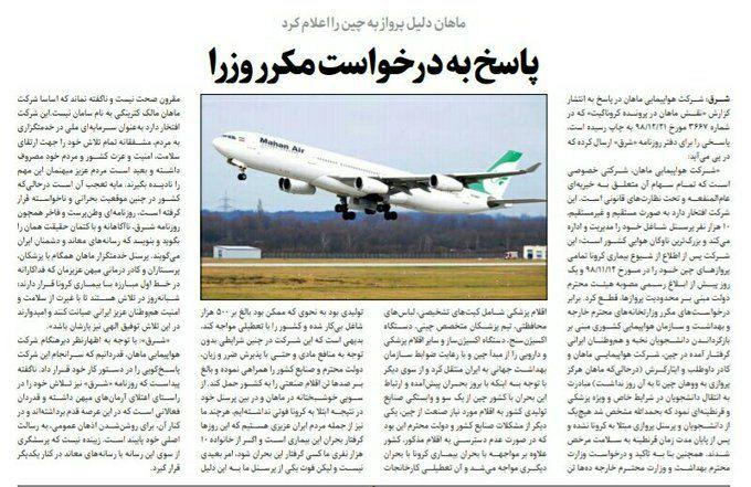 بیانیه هواپیمایی ماهان در مورد پروازهای چین