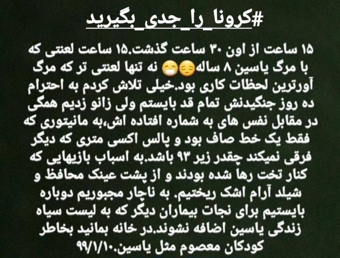 عصرایران - روایت غمانگیز یک پزشک از مرگ کودک هشت سالهی مبتلا به کرونا - منبع: کانال خبری پزشکان