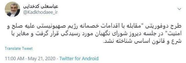 به گزارش ایسنا، عباسعلی کدخدایی در توییتر نوشت:"طرح دو فوریتی «مقابله با اقدامات خصمانه رژیم صهیونیستی علیه صلح و امنیت» در جلسه دیروز شورای نگهبان مورد رسیدگی قرار گرفت و مغایر با شرع و قانون اساسی شناخته نشد."