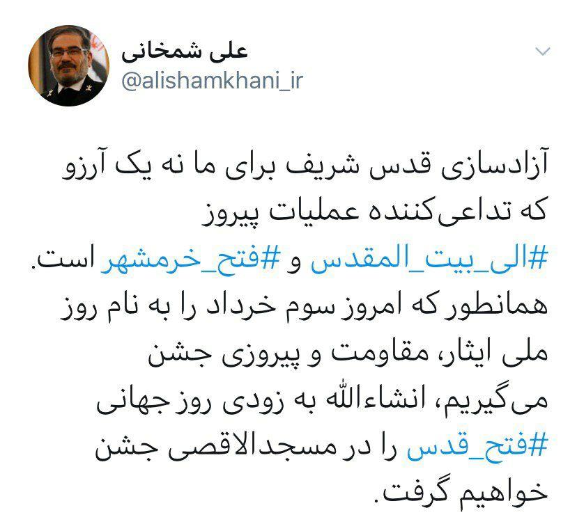 شمخانی: ان‌شاءالله به زودی روز جهانی فتح قدس ⁩را در مسجدالاقصی جشن خواهیم گرفت