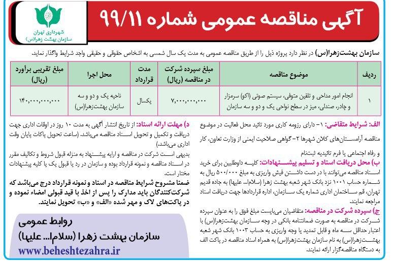 به گزارش عصرایران، براساس آگهی منتشر شده در روزنامه 15 تیرماه 99 کیهان، سازمان بهشت زهرا (بزرگترین قبرستان ایران واقع در جنوب تهران)، مداحی، تلقین متوفی، سیستم صوتی (اکو) سر مزار و چادر، صندلی و میز در سه ناحیه بهشت زهرا را به مبلغ برآوردی 14 میلیارد تومان به مناقصه گذاشته است.
