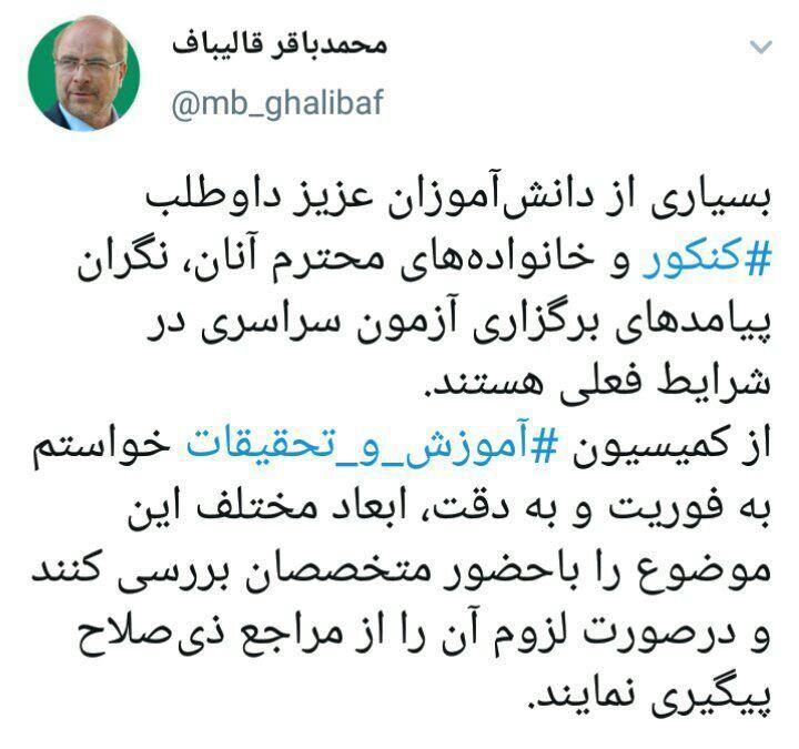دستور قالیباف به کمیسیون آموزش مجلس برای بررسی پیامدهای برگزاری کنکور
