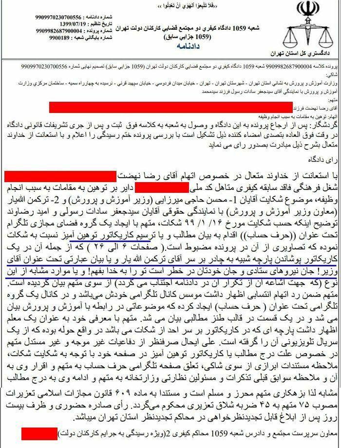 جرم این معلم "توهین به مقامات" از طریق ترسیم کاریکاتور و انتشار آن در کانال تلگرامی بوده است.