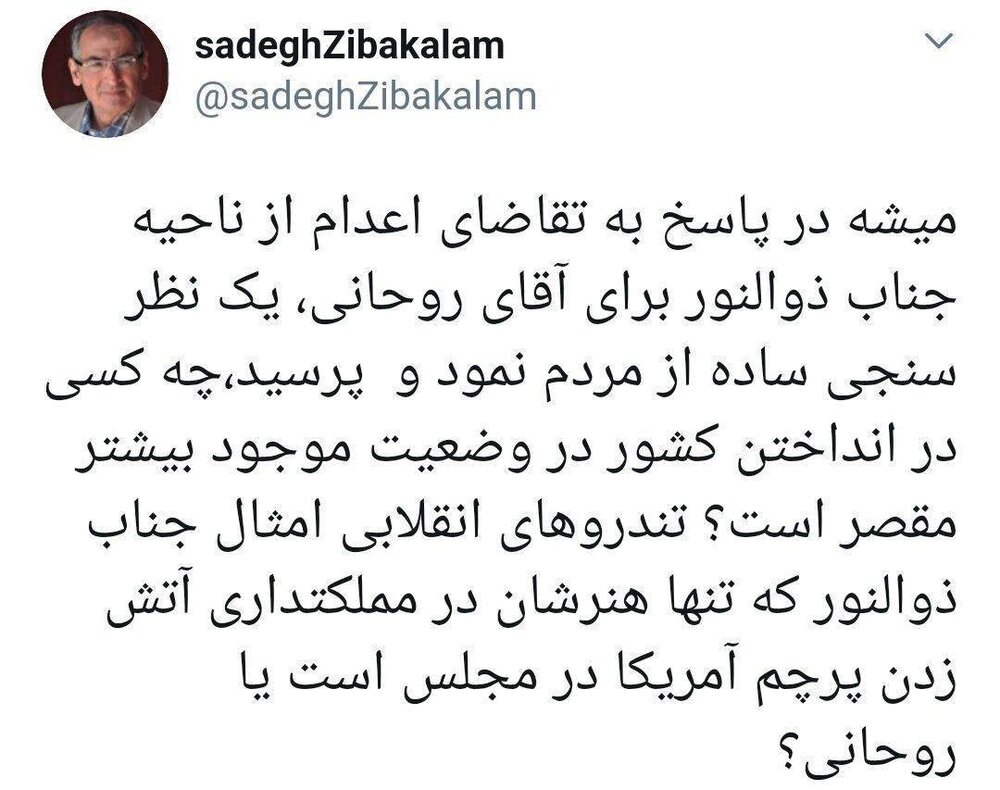 به گزارش عصرایران، صادق زیباکلام استاد علوم سیاسی دانشگاه تهران در واکنش به توئیت رئیس کمیسیون امنیت ملی درباره اعدام حسن روحانی در حساب کاربری‌اش در توئیتر نوشت: «میشه در پاسخ به تقاضای اعدام از ناحیه جناب ذوالنور برای آقای روحانی، یک نظر سنجی ساده از مردم نمود و پرسید، چه کسی در انداختن کشور در وضعیت موجود بیشتر مقصر است؟ تندرو‌های انقلابی امثال جناب ذوالنور که تنها هنرشان در مملکتداری آتش زدن پرچم آمریکا در مجلس است یا روحانی؟»