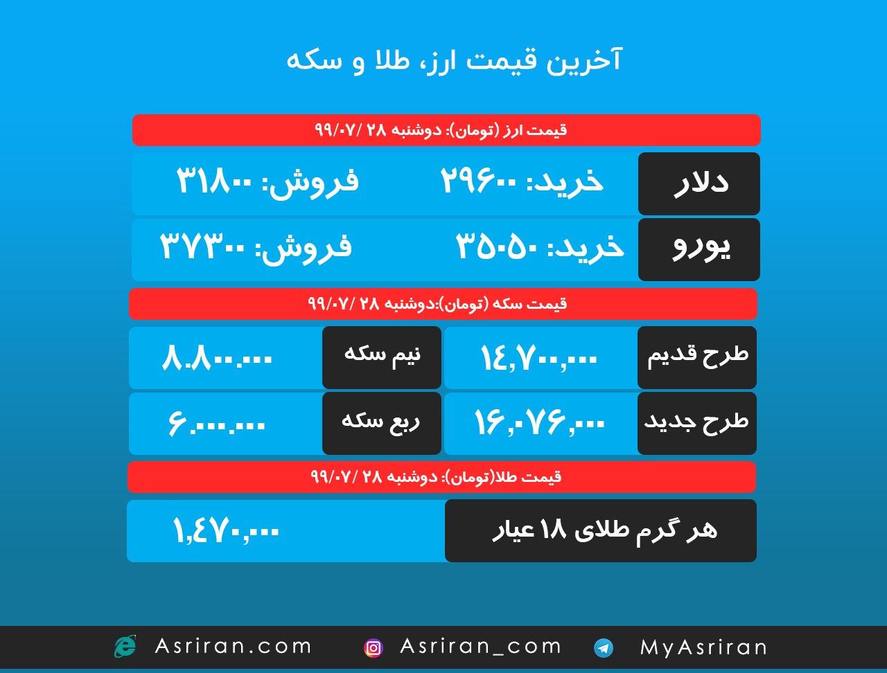 آخرین قیمت ارز، طلا و سکه/ دوشنبه 28 مهر 99 (اینفوگرافیک)