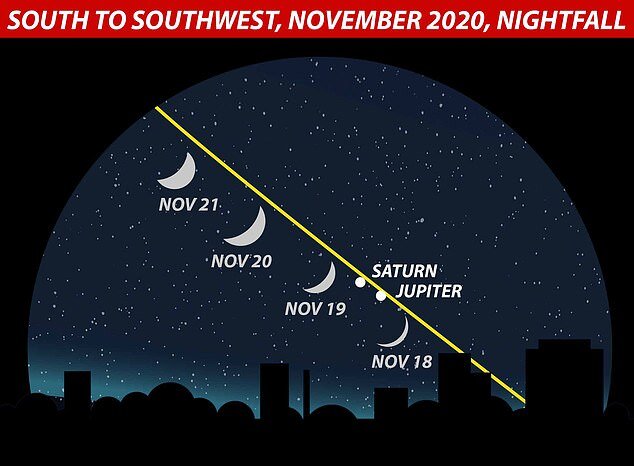هر دو سیاره (زحل و مشتری) درست پس از غروب خورشید در آسمان جنوب غربی قابل مشاهده خواهند بود و اگرچه میلیونها مایل از یکدیگر فاصله دارندنسبتاً نزدیک به هم ظاهر خواهند شد. بین اکنون و انقلاب زمستانی ، مشتری و زحل به تدریج به یکدیگر نزدیکتر میشوند ، تا اینکه در ۲۱ دسامبر در یک راستا قرار میگیرند.