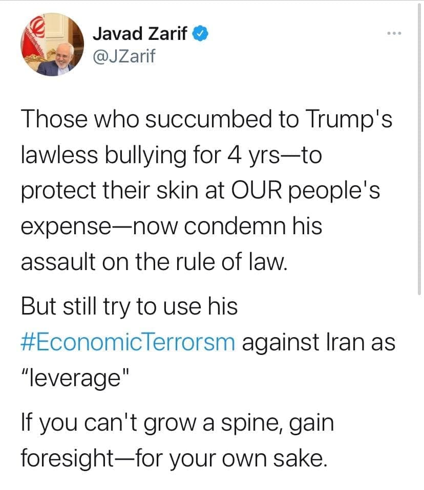 به گزارش ایسنا، محمدجواد ظریف وزیر امور خارجه کشورمان در پیامی توییتری نوشت: ''کسانی که چهار سال در برابر قلدری قانونشکنانه ترامپ سر خم کردند -تا به هزینه مردم ما خود را از آسیب مصون بدارند- حالا تجاوز او به حاکمیت قانون را محکوم میکنند.