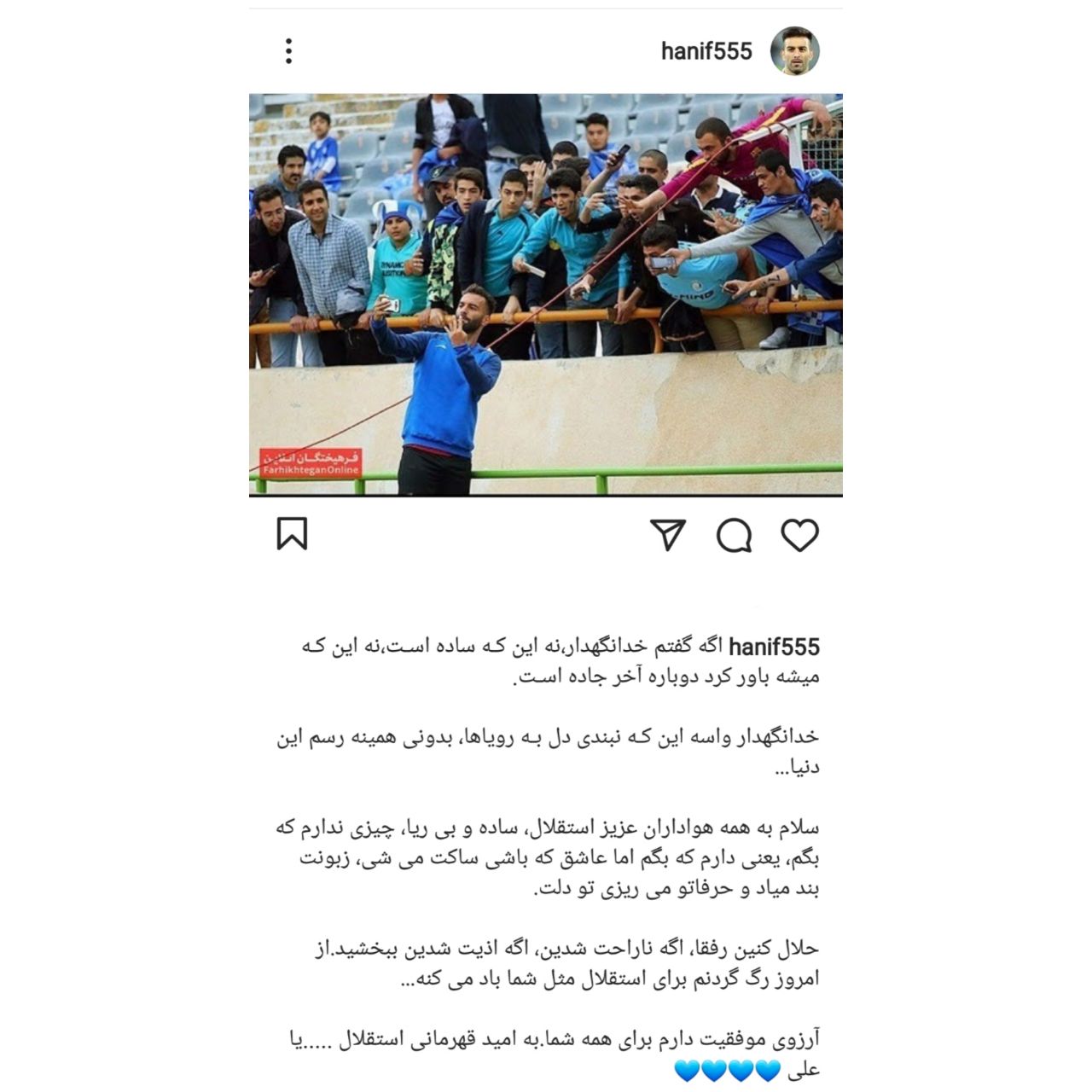 عمران زاده پس از پایان همکاری با استقلال با انتشار پستی از طرفداران این تیم عذرخواهی کرد و از آنها دلجویی کرد.