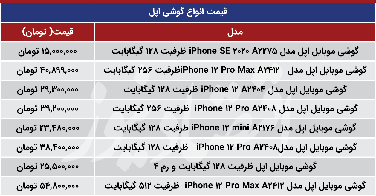 رصد بازار موبایل نشان می دهد که گوشی موبایل اپل مدل iPhone 12 Pro A2412 که یکی از گران ترین گوشی های برند اپل است، درحالی اکنون با قیمت 40 میلیون و 900 هزار تومان به فروش میرسد که در 10 روز گذشته 42 میلیون و 500 هزار تومان قیمت داشته و حدود یک و نیم میلیون افت قیمت را تجربه کرده است.