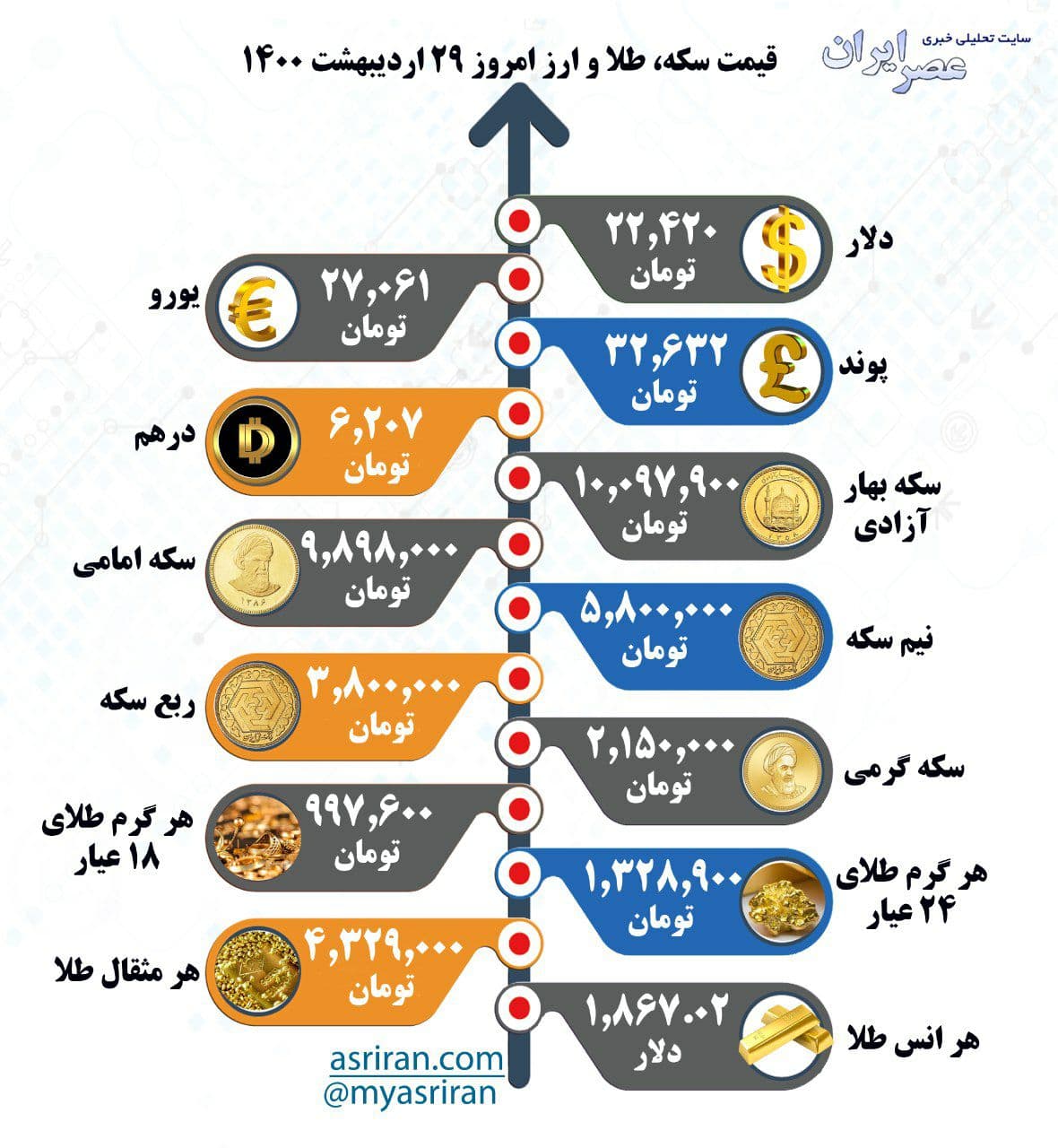 قیمت سکه، طلا و ارز، امروز ۲۹ اردیبهشت ۱۴۰۰