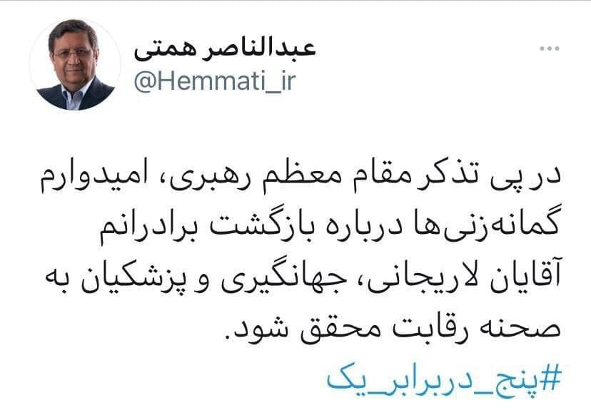 عبدالناصر همتی در حساب کاربری خود در توییتر با استفاده از هشتگ «پنج دربرابر یک» و در واکنش به سخنان امروز رهبری درباره عدم احراز صلاحیت کاندیداها، نوشت: «در پی تذکر مقام معظم رهبری، امیدوارم گمانه‌زنی‌ها درباره بازگشت برادرانم آقایان لاریجانی، جهانگیری و پزشکیان به صحنه رقابت‌ محقق شود.»