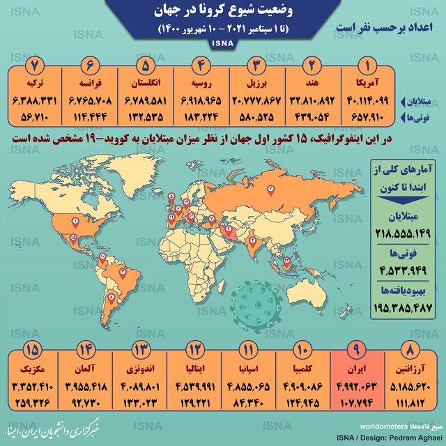 تعداد مبتلایان به ویروس کرونا در جهان، تا صبح چهارشنبه (۱۰ شهریور) به بیش از ۲۱۸ میلیون و ۵۵۵ هزار نفر رسید و تعداد قربانیان این ویروس نیز از چهار میلیون و ۵۳۳ هزار نفر فراتر رفت.