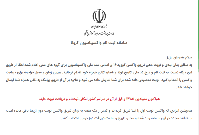 از هم‌اکنون تمامی متولدین ۱۳۸۵ و قبل از آن در سراسر کشور می‌توانند از طریق سامانه salamat.gov.ir محل و زمان تزریق واکسن کرونا را انتخاب کنند.