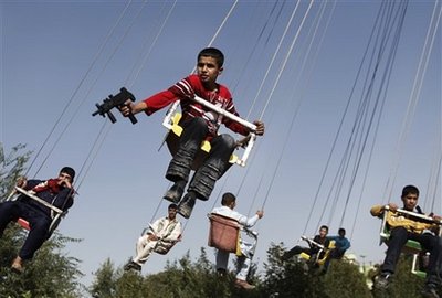 کودکان افغان ساکن کابل که برای تفریح به شهربازی نیمه ویران این شهر می آیند، اکثرا یک سلاح اسباب بازی با خود حمل می کنند.
