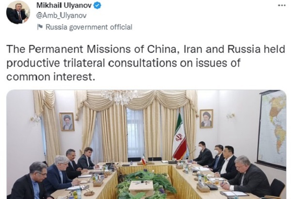 نماینده روسیه در سازمانهای بینالمللی در وین از نشست سهجانبه هیاتهای ایران، چین و روسیه در وین درباره «مسائل مشترک» خبر داد.