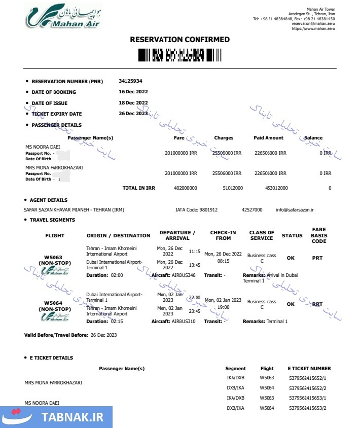 این هم کذب محض و دروغی است که عنوان کردهاند. بلیتهای همسر و دخترم موجود است و مردم میتوانند تاریخ صدور و تاریخ رفت و برگشت آنها را ببینند. (علی دایی تصویر بلیت دو طرفه همسر و فرزند خود را در اختیار تابناک جهت انتشار قرار داد که می بینید)