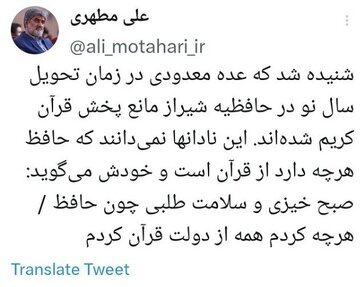 علی مطهری نماینده سابق مجلس در توییتی نوشت: شنیده شده که عده معدودی در زمان تحویل سال نو در حافظیه شیراز مانع پخش قرآن کریم شدند.این نادانها نمی دانند که حافظ هر چه دارد از قرآن است و می گوید:صبح خیزی و سلامت طلبی چون حافظ / هرچه کردم همه از دولت قرآن کردم