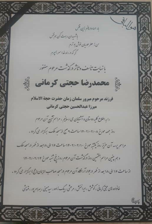 محمدرضا حجتی کرمانی برادر محمدجواد حجتی کرمانی درگذشت. مراسم تشییع آن مرحوم فردا جمعه ساعت ۹ صبح از مسجد ملک کرمان برگزار می گردد./منبع: جماران