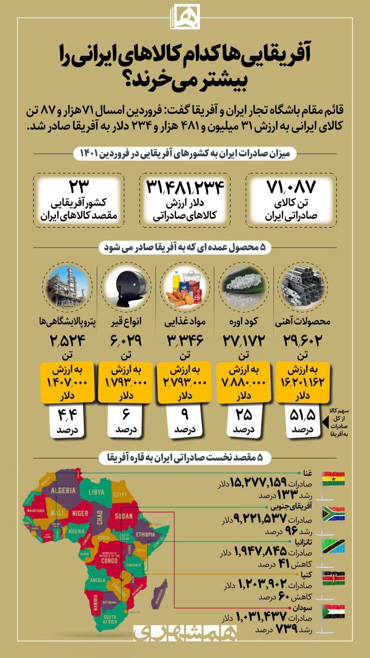 قائم مقام باشگاه تجار ایران و آفریقا گفت: در سبد صادراتی کالاهای ایرانی به آفریقایی‌ها در فروردین، ۲۹ هزار و ۶۰۲ تن محصولات آهنی به ارزش ۱۶ میلیون و ۲۰۱ هزار و ۱۶۲ دلار با سهم ۵۱.۵ درصدی از کل صادرات به آفریقا در صدر قرار گرفت.