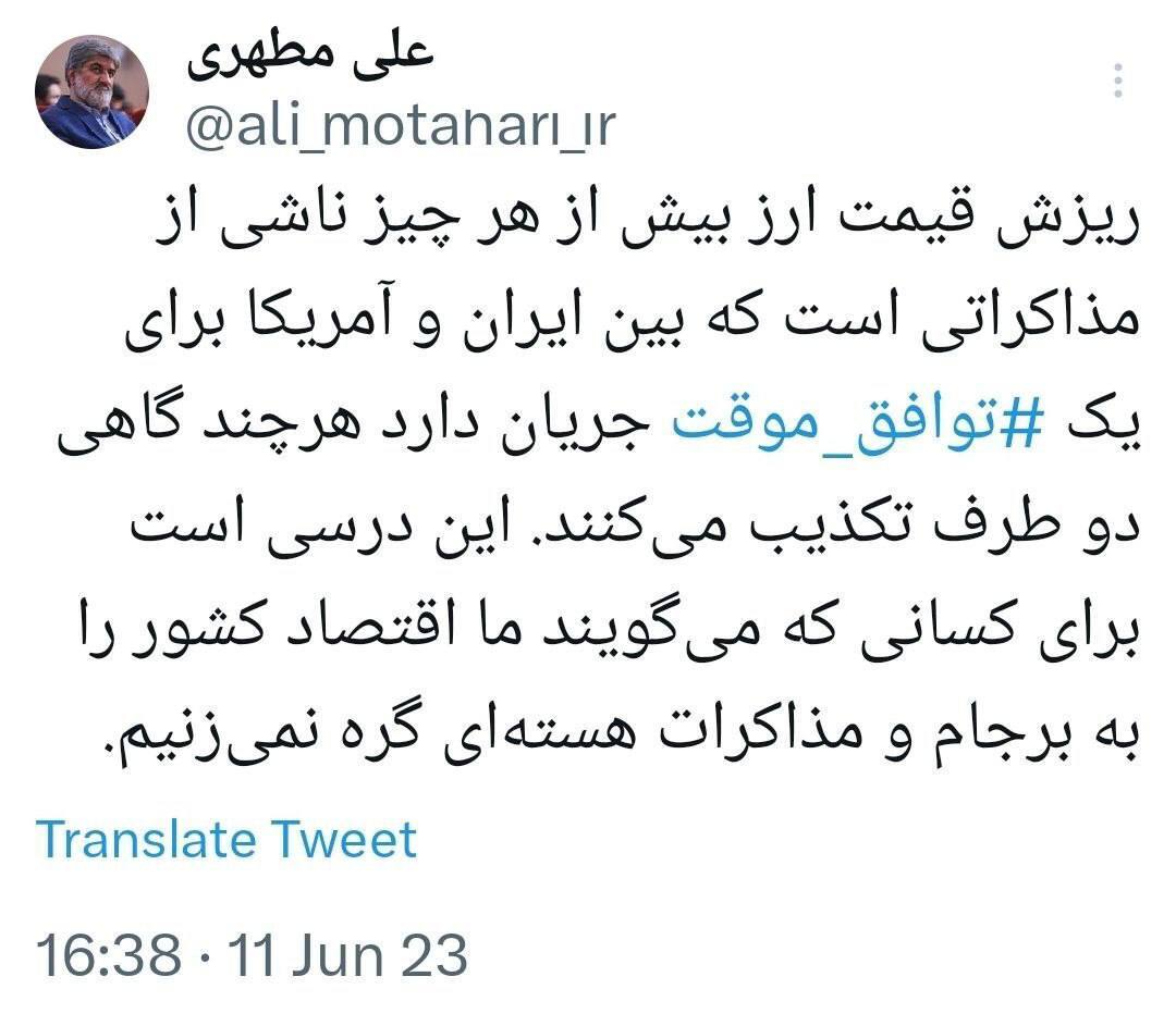 علی مطهری نماینده سابق مجلس در توییتر نوشت: ریزش قیمت ارز بیش از هر چیز ناشی از مذاکراتی است که بین ایران و آمریکا برای یک توافق موقت جریان دارد هرچند گاهی دو طرف تکذیب می‌کنند.  این درسی است برای کسانی که می‌گویند ما اقتصاد کشور را به برجام و مذاکرات هسته‌ای گره نمی‌زنیم.